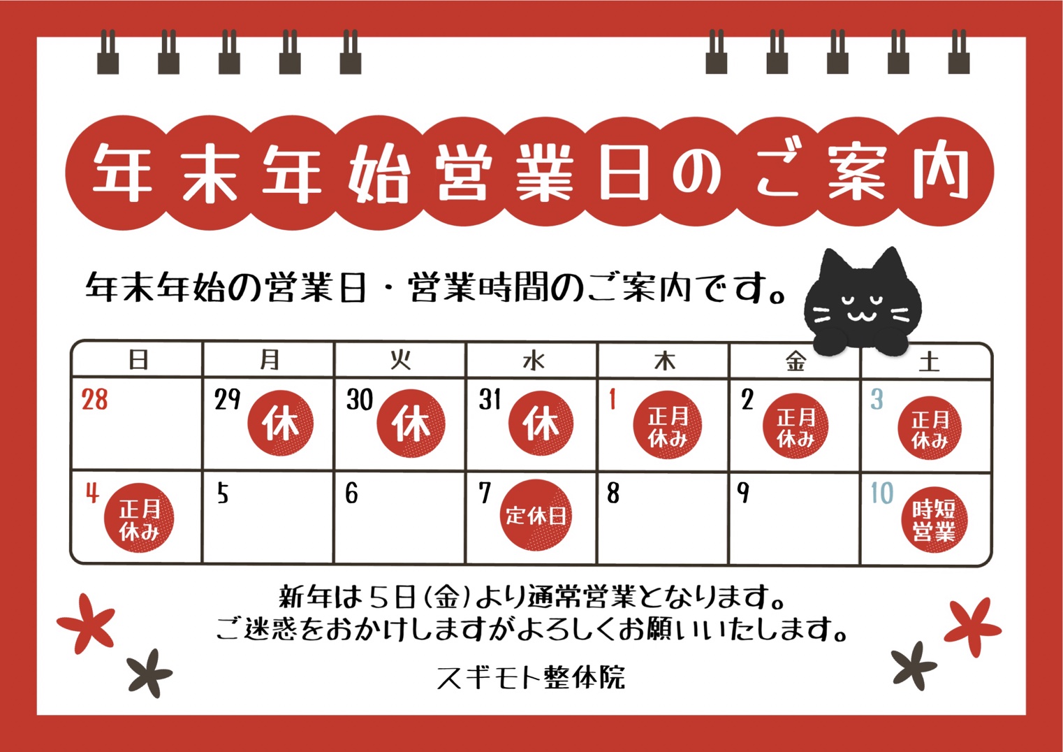 2025年 年末年始のお知らせ 公開日:2025年12月22日 お知らせ未分類 いつもありがとうございます。 年末年始のお知らせです。 当院の年内営業は27日(土)午前までとなります。 最終日はすでにご予約の方で枠が埋まっております 。 年明けは5日(月)からスタートです。 7日(水)は、研修日となっておりお休みをいただきます。 ご注意ください。 事故やお怪我、風邪などの感染症に十分お気をつけ頂き、楽しい年末年始をお過ごしください。 スギモト整体院スタッフ一同 関連記事 2020年末休暇のお知らせファスティングって何?島田市で美容鍼★減量に成功!R2.5月のお知らせコアレ☆患者様の声☆ 投稿ナビゲーション 減量に成功!